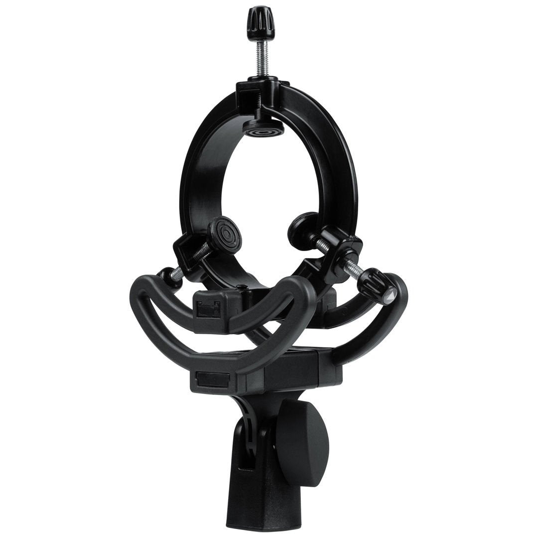 Three centrally mounted rubber grip hinges adjust to secure the microphone. The inner diameter adjusts to accommodate large-diaphragm microphones ranging from 18 to 55mm. The shockmount attaches to any standard microphone stand with a 5/8'-27 thread.
