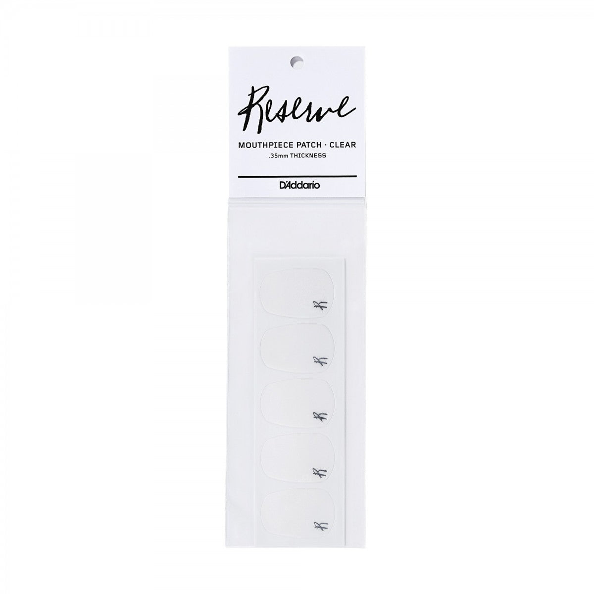 Reserve Mouthpiece Patches Specially designed to protect your mouthpiece, the Reserve mouthpiece patch is ideal for clarinetists and saxophonists of all ages and abilities. Our unique material adheres securely to the mouthpiece, yet enables easy removal or transferal when needed; it will not leave residue. Ideal for educational purposes, the Reserve mouthpiece patch prevents the teeth from sliding on the mouthpiece. It can be a useful tool in promoting the correct development of various aspects of embouchure and tone production, especially how much mouthpiece to take and the prevention of biting. Protects mouthpiece and prevents teeth from sliding Suitable for use on clarinet or saxophone mouthpieces Each package contains one sheet of 5 mouthpiece patches Available in both black (.80mm thickness) and clear (.35mm thickness) options
